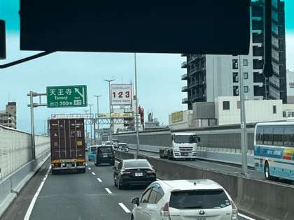 天王寺にて高速道路を下りました。あと15分程度で学校に到着する予定です。