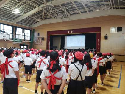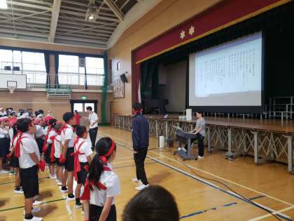 今日の児童集会は運動会の応援合戦に向けて赤白応援歌の「ゴーゴーゴー」の練習をしました。応援団担当の先生方が前で指導して盛り上げています。赤白どちらも大きな声で元気よく歌っていて、今年も運動会が大いに盛り上がっている様子が目に浮かびます。