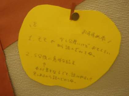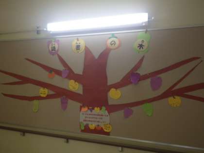 学校では、図書館司書の先生が、読書の日にちなんで4階階段の掲示板に「読書の木」を掲示して、みんなが紹介したい本を果物に書いて紹介しています。