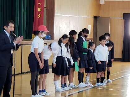 次に運営委員会から、先日の全校遠足で行ったオリエンテーリングで成績の良かった班の表彰がありました。みんなから暖かい拍手が送られました。