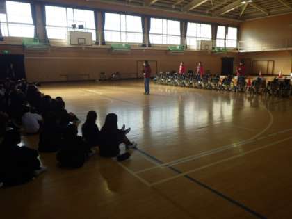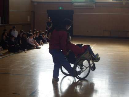 今日の3・4時間目に心身障がい者リハビリテーションセンターから講師の方に来ていただいて、車いすの自走・介助走行体験をしました。