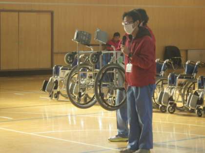 まず最初に、車いすの部品について、確認しました。ブレーキやアームレスト、ステッピングバーなど、各部品とその使い方について、学びました。