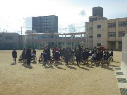 運動場に出て、校舎の1階を介助走行します。運動場から靴箱のところにあがるスロープも車いすを押しながらだと、一苦労です。廊下を通って玄関に行きスロープの上り下りをします。そこから、1号館の方に行って、運動場に出るスロープでは後ろを向いて安全に下る練習もします。始めの運動場に戻ったら、あいさつをして次の人と交代します。
