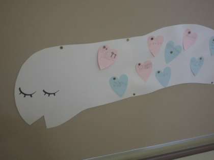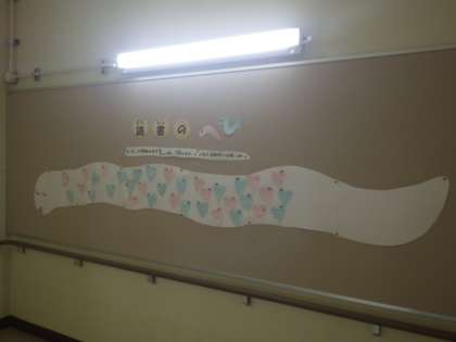 図書館に向かう階段の踊り場掲示板にかわいい蛇が登場しました。へび年にちなんで登場した白へびは「読書のへび」という名前です。みんなのお気に入りの本を教えてもらいたがっています。早速、ハートマークに自分のお気に入りの本を書いて教えてくれている人がたくさん。