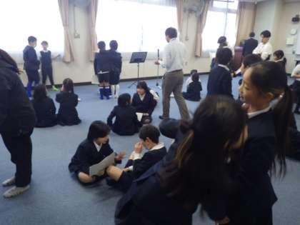 今回のワークショップの主な目的の説明の後は、早速ネタあわせをします。コンビやトリオで準備した台本を練習します。どのグループも大きな声を出して練習していますが、自分たちの台本に集中していて、すごい熱気です。「ムジンゾウ」のお二人もグループを回ってアドバイスをしてくださっています。