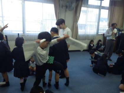 今日は漫才ワークショップの3年生、4年生の日です。講師の漫才師さんは「ムジンゾウ」のお二人です。お二人は生野区住みます芸人としても活動されています。