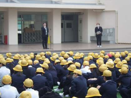 月曜日は児童朝会の日です。今週は副校長先生から、音楽会に向けて練習をがんばっている様子と、本番で十分に力が発揮できるように健康管理には注意してくださいというお話をいただきました。