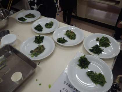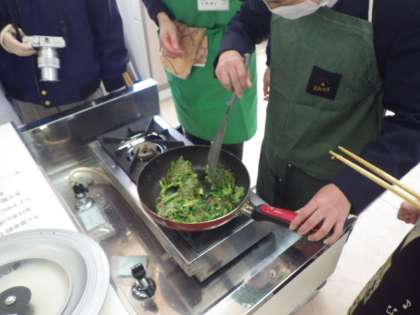 さっと湯通ししたり、焼いたり、みんな楽しみながら大地の会の方に教えてもらいながら調理を進めていました。