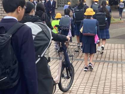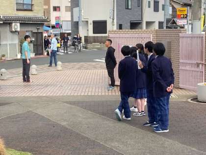 現在、部活動の勧誘が行われており、各部活動の代表者が登校する生徒に声をかけています。
