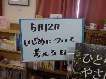 5月12日(月)の「いじめについて考える日」の集会を受けて、図書室では「いじめについて考える日」特設コーナーが図書カウンターに開設されています。