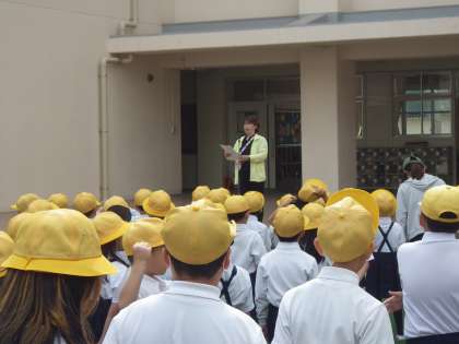 今日は児童朝会です。まず副校長先生から安全な学校生活についてお話をいただきました。次に区役所の人から交通安全についてのお話がありました。昨今では、自動車や自転車の危険運転などがニュースでも見られることが増えました。