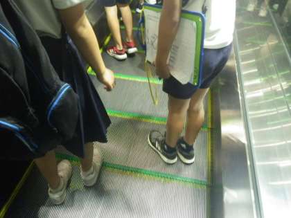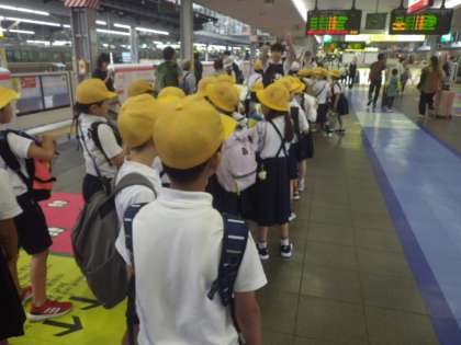 いよいよ大阪駅に到着です。広くて複雑なホームの様子に圧倒されている児童もいました。登りはエスカレーターで3階の連絡橋。エスカレーターが途中で歩く歩道のようになることに感心して新しい発見があったことを喜ぶ姿が見られました。