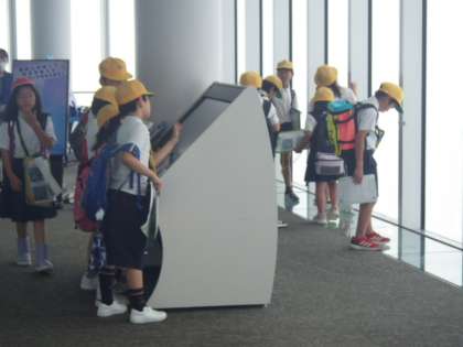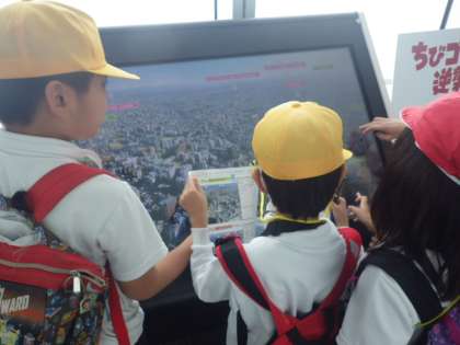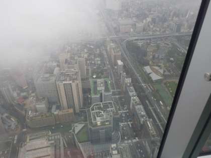 展望台にはこういう時のためにも役立つように大きなモニターがあり、そこから見える景色と主要な建物や地形についての説明が映されています。また、雲が流れて展望台の周りの様子が見えることもあり、天王寺公園や動物園の様子、JR天王寺駅を上から見下ろすことができました。うわー見える!と班のみんなを集めて眼下の様子をしっかりと観察していました。
