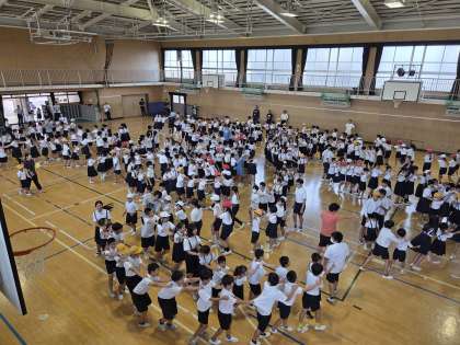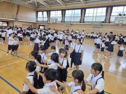 今日の児童集会はじゃんけん列車をしました。音楽に合わせて体育館の中を移動して音楽が止まったら近くの人とじゃんけんします。
