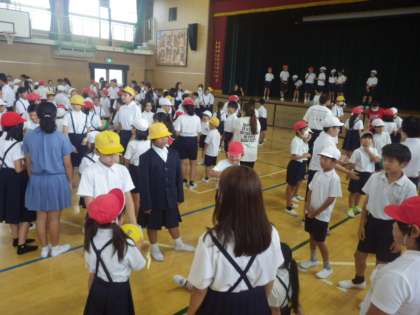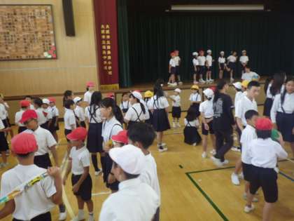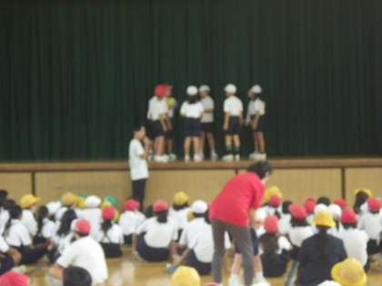 班で輪になって、集会委員会の人が「ゴロゴロゴロゴロ・・・・」と言っている間ボールを手渡しで回します。「どかん!」といったときにボールを持っていた人が輪の真ん中に移動します。これを続けて「どかん!」となった人が真ん中の人と交代していきます。