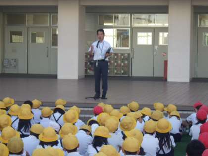 9月21日から9月30日まで「秋の交通安全運動」の期間です。登下校はもちろんのこと、放課後でも交通安全にはしっかりと気を付けて安全に過ごせるように意識を持ってほしいことや、自転車に乗るときにはヘルメットを着用すると事故で死亡する割合がグッと減少することなどをお話しいただきました。