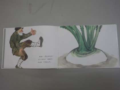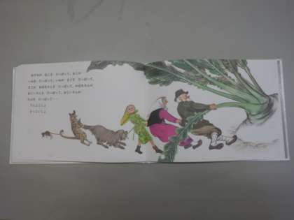 今日のお話で世界旅行は「おおきなカブ」のお話でした。おばあさんがおじいさんを引っぱって・・・のフレーズで皆さんもよくご存じのお話だと思います。
