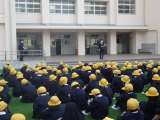 今日の児童集会は運動場で赤と黄色グループが大なわとび、青と緑グループが体育館で...