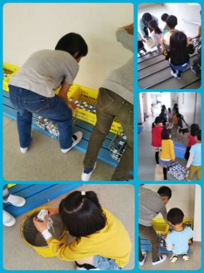 1年生が給食当番を頑張っています。自分たちで協力して、食器や食缶、パン箱などを運んでいます。後片付けもできるようになりました。