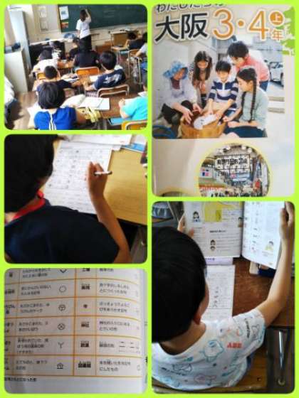 消防署や市役所、警察、学校など、地図に載っている記号を調べて、覚えています。たくさん覚えましょうね。