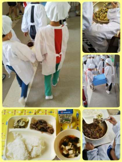 1年生の給食当番が、給食の準備をしています。牛乳、食器、ごはん、大おかず、小おかずと、重たいですが、自分たちで力を合わせ、運びます。入学から一カ月がたち、給食の準備も堂々としてきました。