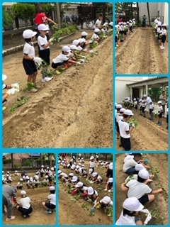 地域の方が来られて、2年生と一緒にさつまいもを植えました。昨日の雨で畑が水浸しでしたが、皆さんの力で子どもたちが植えやすいように準備してくださいました。