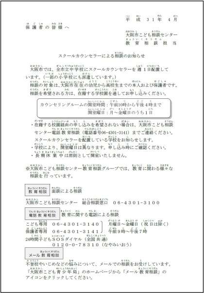 4月にお知らせしましたが、大阪市全中学校にスクールカウンセラーが配置されています。旭区では、今年度より小学校にも月2回(午前1日、午後1日)配置されることとなりました。清水小学校には、月曜日に来校されます。