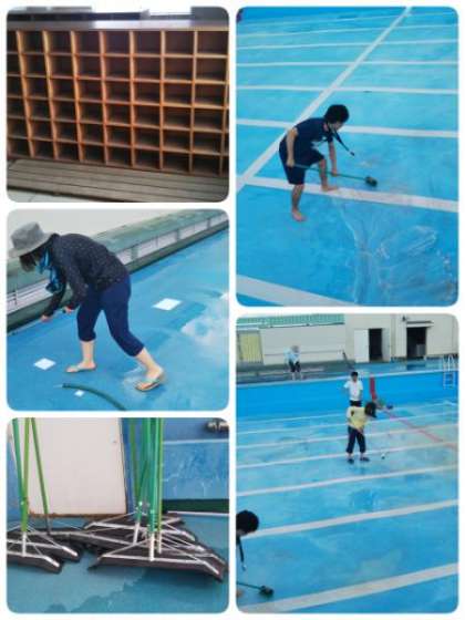 6月17日から始まるプール学習に向けて、職員でプール清掃を行いました。細かいところまで、すみずみまでこすって、ピカピカになりました。