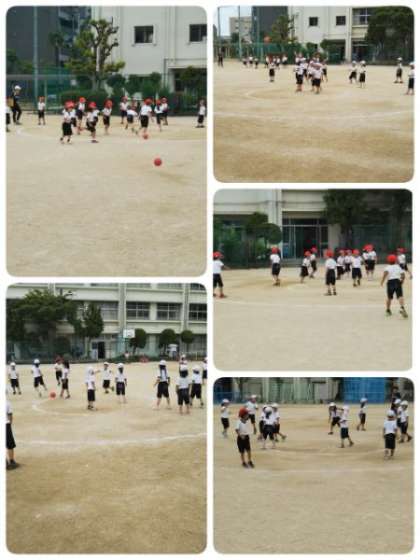 1年生の体育です。「ボール遊び」領域で「なかあて」をしました。