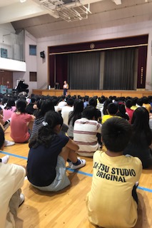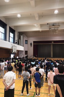 講堂に集まった子どもたちは、校長先生、森川先生の話に熱心に耳を傾けていました。夏休みにチャレンジすること、夏休みの過ごし方などについて、しっかりと考えながら聞き入っていました。