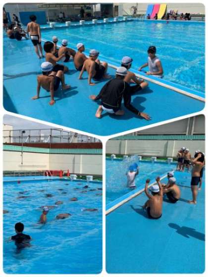 夏休みの取り組み、プール開放の様子です。みんな、自分の目標に向かって頑張っています。日焼けして、真っ黒な児童が増えてきました。