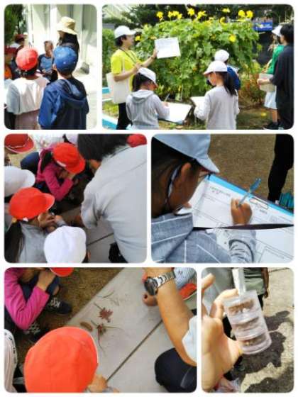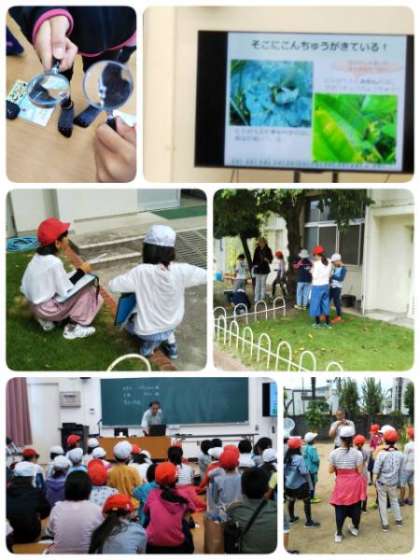 大阪市環境局の方に来ていただき、「生き物さがし」の出前授業を行いました。説明の後、班に分かれて、校庭を見て回りました。