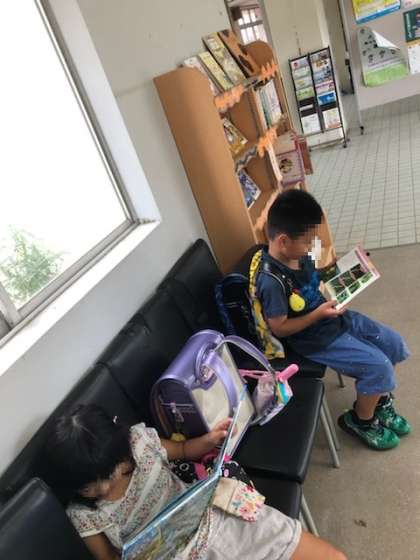 1年生が下校途中にほっとスペースで本を読んでいます。
