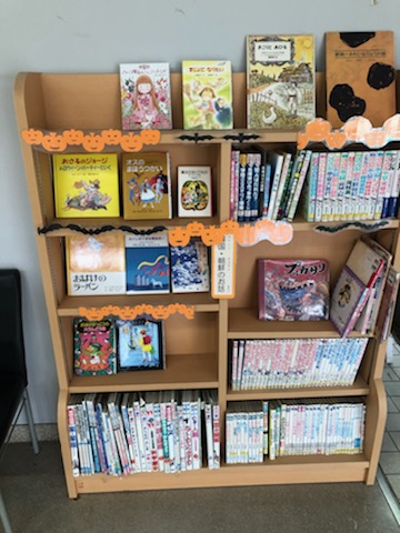 玄関のほっとスペースには、図書館ボランティア、図書館コーディネーターや学校図書館補助員さんが用意してくださった、季節やイベントごとの本のミニコーナーがあります。