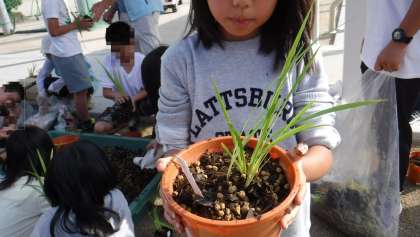 校内美化委員会が区役所の方と地域の方とで花菖蒲の植え替えをしました。