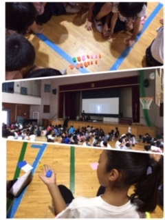 全校集会で、子どもたちが平和への祈りを込めて、千羽鶴と折り亀を折りました。折った鶴と亀は、6年生が修学旅行で10月の28日に平和記念公園の慰霊碑にお供えし、祈りをささげてきます。