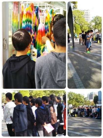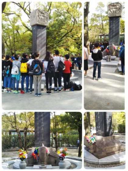 原爆の子の像では、千羽鶴をお供えしてから群読と平和の歌を歌いました。韓国人原爆犠牲者慰霊碑では、折亀をお供えしました。