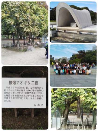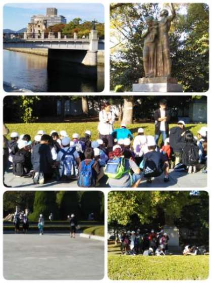6年生全員で記念写真を撮ったあと、平和記念公園内を班ごとにフィールドワークしました。被爆アオギリ2世の木など、公園内にある様々な碑などを見て回りました。