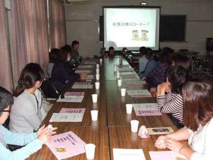 区内の栄養教諭の方から学校給食の意義についてのお話や、旬の食べ物や行事献立など、季節を感じるように献立を工夫しているお話など詳しくしていただきました。
