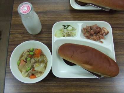 この日のメニューは、鶏肉のチリソース焼き、中華煮、甘酢あえ、黒糖パン、牛乳でした。