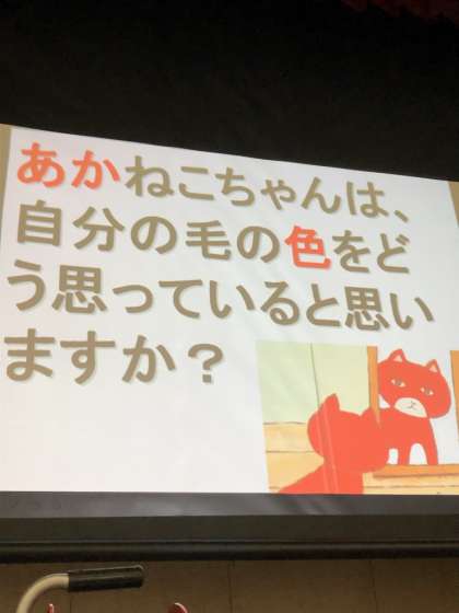 全校集会では「わたしはあかねこ」の読み聞かせをしました。