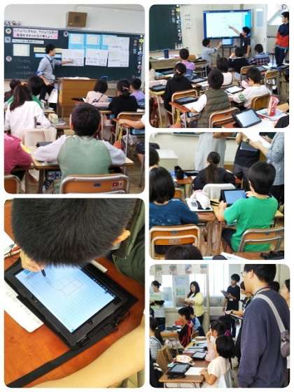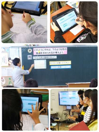 4年生の研究授業を行いました。算数「面積」の単元です。「下のような図の面積を求めよう」という公式だけでは、求めにくい問題について考えました。自分の考えをタブレットを使って確認し、発表する授業を行いました。