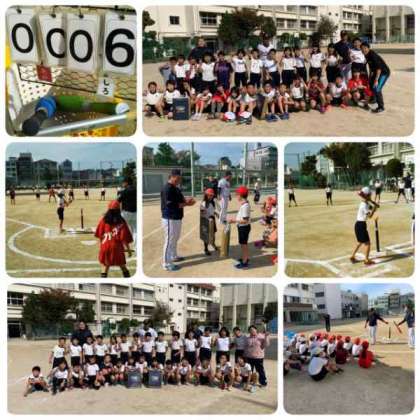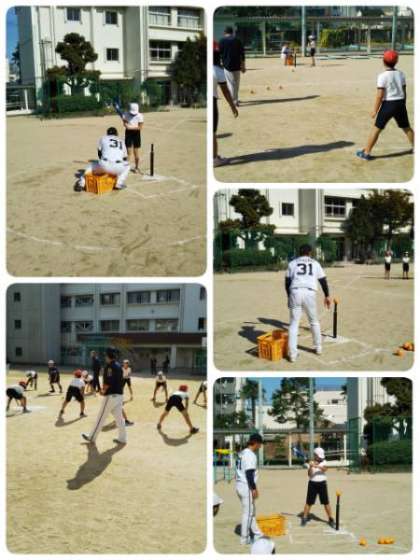 大阪市教育委員会「トップアスリート・夢授業」でオリックスバッファローズの方に来ていただきました。バッティングや守備の基本を教えていただいた後、Tボールゲームをしました。赤チーム対白チームに分かれて、白熱した試合を行いました。
