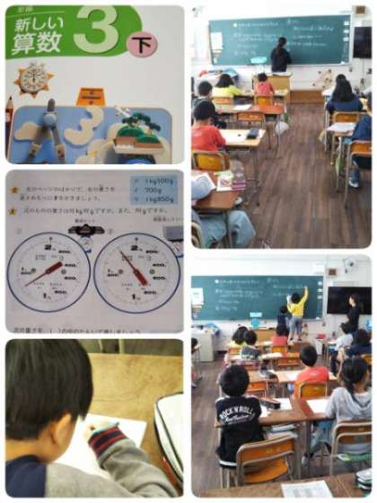 3年生の算数の授業の様子です。はかりを使って、重さをはかり、2つのものの重さの「全体の重さの求め方」について考えました。全体の重さは、計算で求められることがわかりました。 (11月8日 記事)
