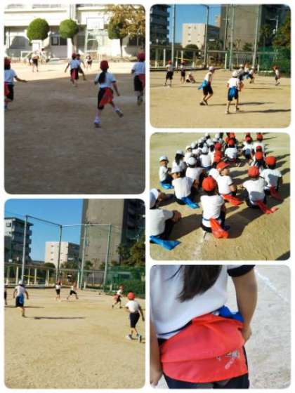 2年生の体育の授業の様子です。「しっぽとり」をしました。みんな素早く逃げ回って、なかなか捕まえることができません。チームに分かれて、早くとったほうが勝ちです。たくさん動いて、運動量も多く、みんな元気に走り回っていました。 (11月8日 記事)