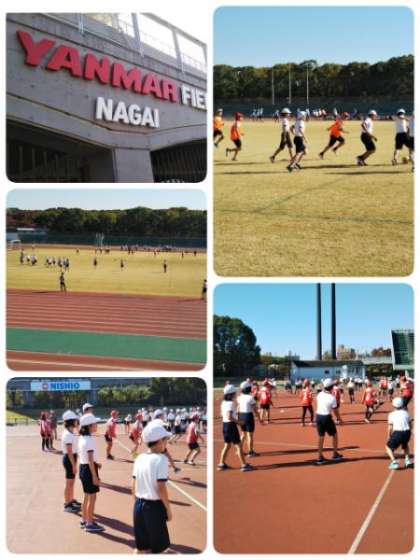 午前中は、長居のヤンマーフィールドにて、サッカーとドッジボールを行いました。広くて大きな芝生の上を思いっきり走りまわり、ボールを追いかけていました。他の学校の児童とも話をする姿も見られました。