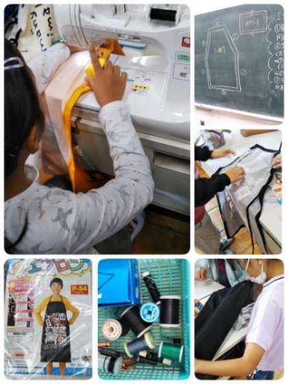 家庭科の授業の様子です。5年生は、ミシンで「エプロン」を製作しています。ミシンでまっすぐ縫うように、ゆっくり丁寧に頑張っています。