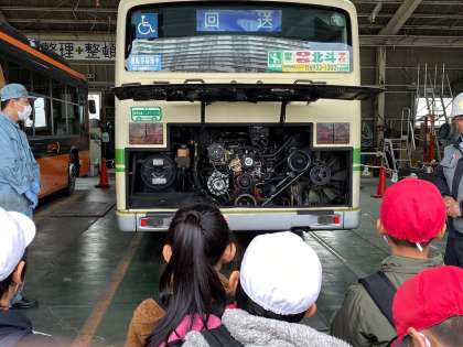 それぞれが電車に乗って、無事、守口車庫に着くことができました。車庫では、働く方の話を聞きながら見学をしました。バスの普段見れないところも見学でき、子どもたちも大喜びでした。