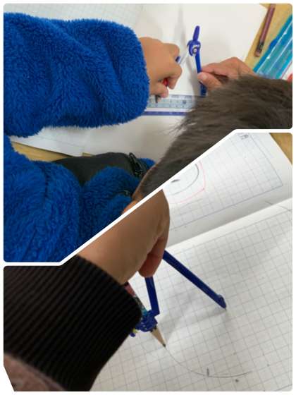 3年生の算数の授業でコンパスの使い方を学習しています。上手に使うことが難しいですが、頑張って練習しています。