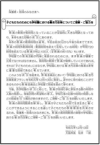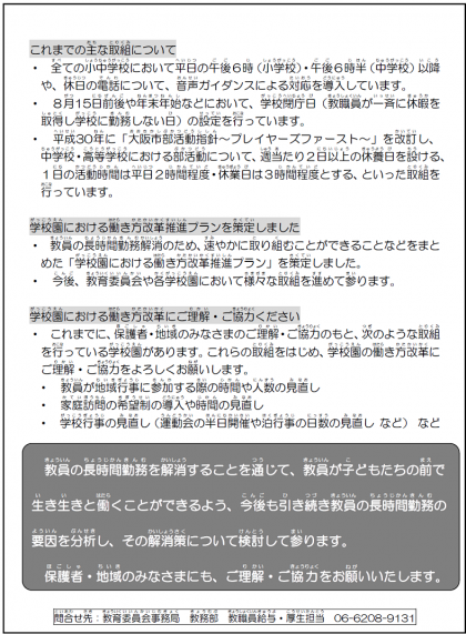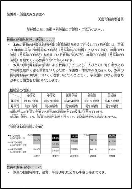 学校園における働き方改革について、大阪市教育委員会より通知文書が来ております。